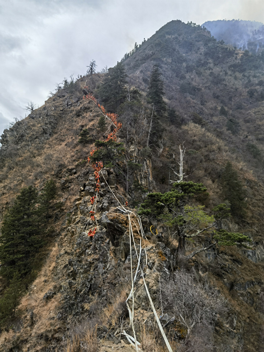 一難——懸崖絕壁險,人工作業(yè)難?;饒鑫挥诘境强h東義河左岸,呈東西走向的高山峽谷間,溝壑縱橫、溝窄林密、坡陡谷深,絕大部分坡度在70度以上,距起火點海拔3840米、起火點至河面高差近1600米;到起火點僅有一條狹窄道路沿陡峭山脊艱難通行,可謂“華山一條路,登臨猶比上天難”,人工作業(yè)極其困難。