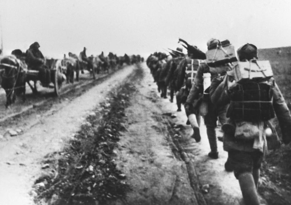 ↑ 抗日戰(zhàn)爭期間,新四軍在蘇北冰天雪地中行進(jìn)。