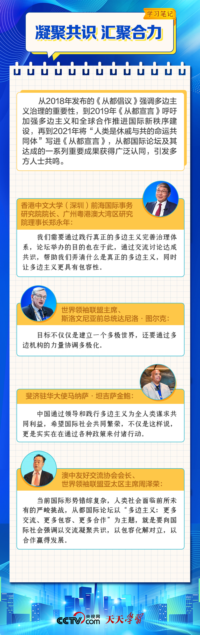 天天學(xué)習(xí)12月4日,習(xí)近平主席在致“2023從都國際論壇”的賀信中強(qiáng)調(diào),面對前所未有的世界之變、時(shí)代之變和歷史之變,人類社會必須團(tuán)結(jié)起來,堅(jiān)持互學(xué)互鑒、開放包容、合作共贏,弘揚(yáng)全人類共同價(jià)值,共同建設(shè)更加美好的世界。