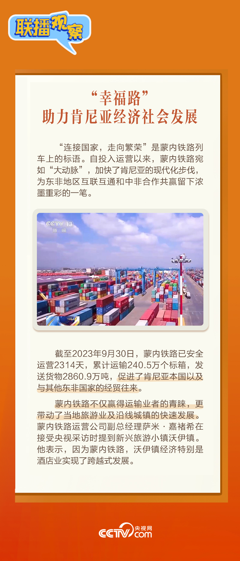 此前,習(xí)主席在外事活動(dòng)中多次提及蒙內(nèi)鐵路,《新聞聯(lián)播》也持續(xù)關(guān)注這條路的建設(shè)及開通后的運(yùn)營(yíng)情況。這條“幸福路”有何特別之處,習(xí)主席為何頻頻提及?它的建成通車給當(dāng)?shù)貛砟男┳兓??《?lián)播觀察》邀您一同了解。