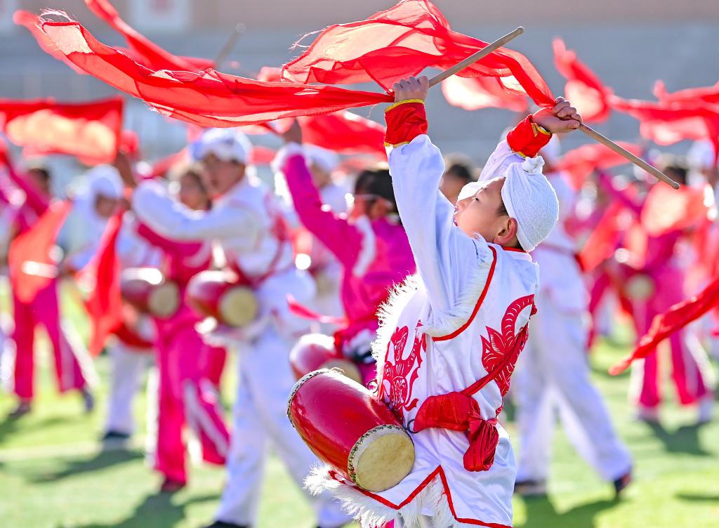 ??2023年11月16日,內(nèi)蒙古鄂爾多斯市鄂托克前旗第二小學(xué)的學(xué)生在大課間表演安塞腰鼓。該校將安塞腰鼓列入學(xué)校的校本課程和大課間活動(dòng),聘請民間藝人傳授技藝,讓非遺文化在校園中傳承。新華社發(fā)(王正攝)