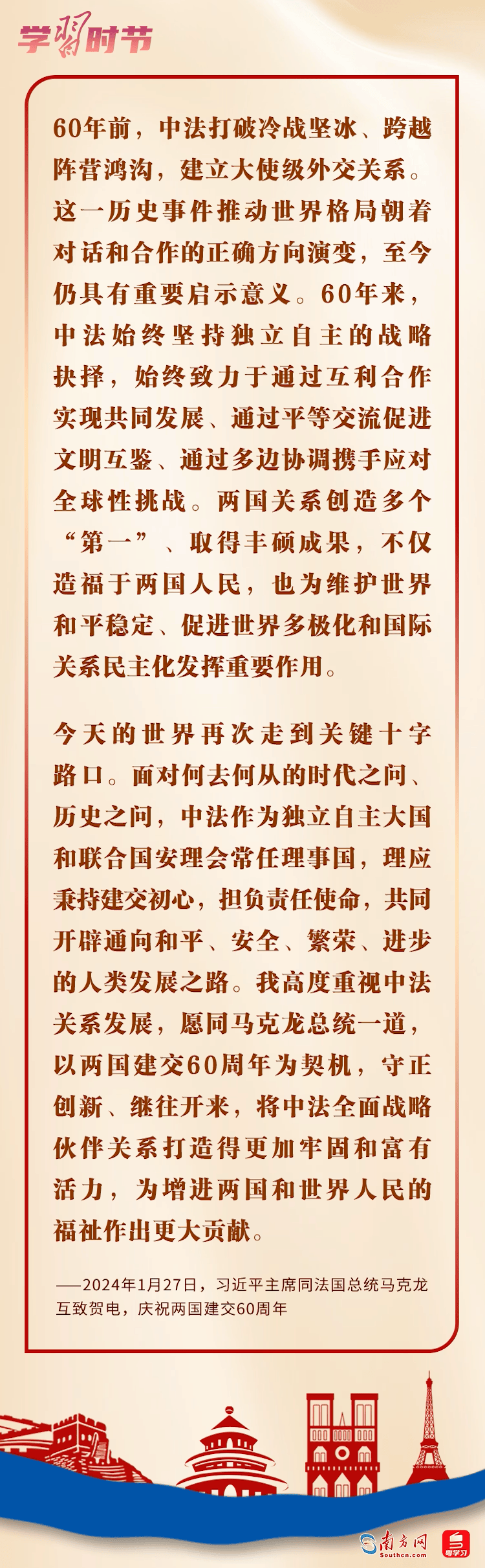 1月27日,國家主席習近平同法國總統(tǒng)馬克龍互致賀電,慶祝兩國建交60周年。習近平主席指出,60年前,中法打破冷戰(zhàn)堅冰、跨越陣營鴻溝,建立大使級外交關系。兩國關系創(chuàng)造多個“第一”、取得豐碩成果,不僅造福于兩國人民,也為維護世界和平穩(wěn)定、促進世界多極化和國際關系民主化發(fā)揮重要作用。