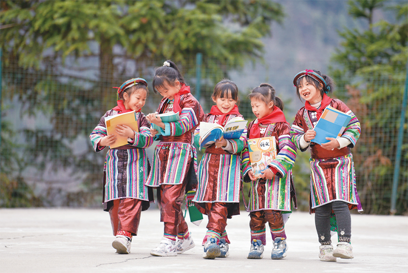 位于貴州省黔東南苗族侗族自治州從江縣大山深處的西山鎮(zhèn)中寨教學(xué)點,是一所全校均為瑤族學(xué)生的“微小學(xué)”。近年來,隨著教學(xué)條件逐漸改善,學(xué)校發(fā)生了翻天覆地的變化。圖為2023年2月16日,領(lǐng)到新書的瑤族學(xué)生在一起交流。 新華社記者 楊文斌/攝