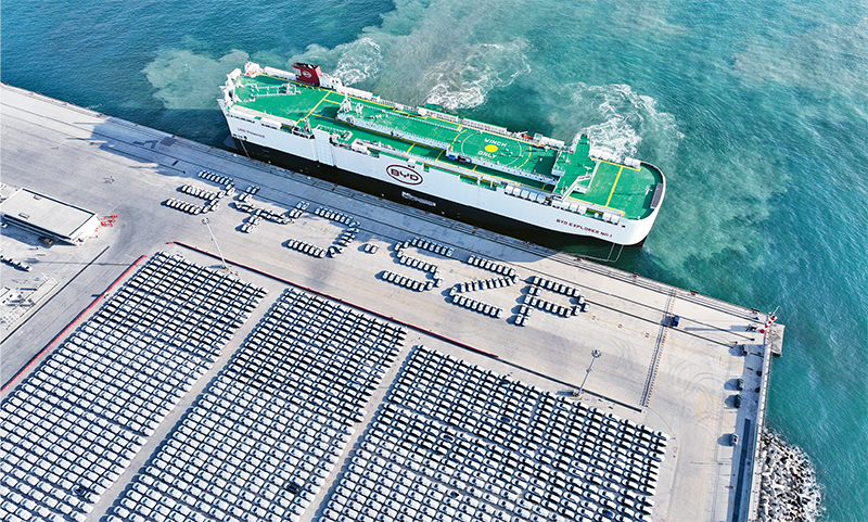2023年,我國電動載人汽車、鋰離子蓄電池和太陽能電池為代表的“新三樣”產(chǎn)品合計出口首次突破萬億元大關(guān),展現(xiàn)了中國制造的新優(yōu)勢。圖為2024年1月14日,比亞迪“開拓者1號”(“BYD EXPLORER NO.1”)滾裝船抵達深圳港小漠國際物流港。 新華社發(fā)