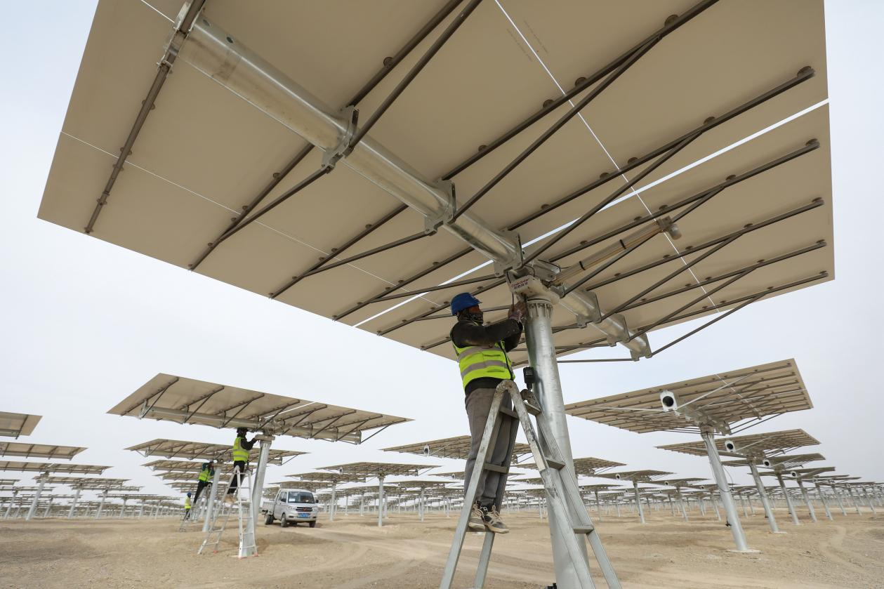 △ 2024年3月12日,甘肅省酒泉市金塔中光太陽能10萬千瓦光熱+60萬千瓦光伏項目現場,施工人員有序作業(yè)。