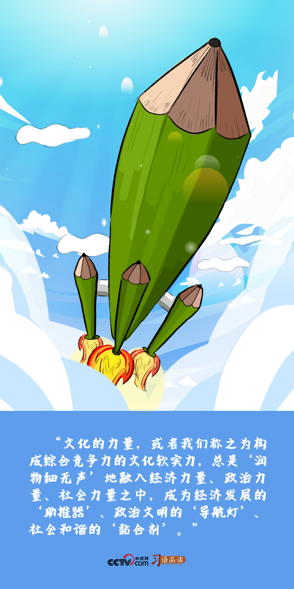 習(xí)近平用“助推器”“導(dǎo)航燈”“黏合劑”來打比方,闡述文化力量與經(jīng)濟力量、政治力量、社會力量交融互動、融合發(fā)展的關(guān)系,形象地解析其在經(jīng)濟發(fā)展、政治文明、社會和諧等方面所起到的重要作用。
