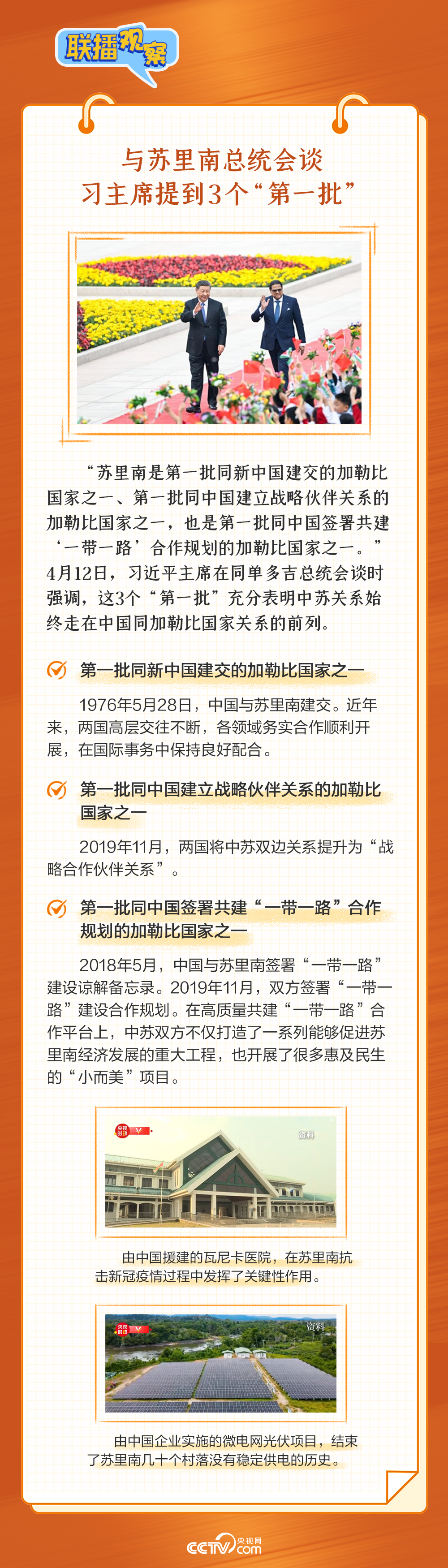 4月12日下午,習(xí)近平主席在北京人民大會堂同來華進(jìn)行國事訪問的蘇里南總統(tǒng)單多吉舉行會談。此前,外交部發(fā)言人曾表示,2024年是中國同蘇里南建立戰(zhàn)略合作伙伴關(guān)系5周年,中方歡迎單多吉總統(tǒng)在這一特殊時(shí)刻訪華。