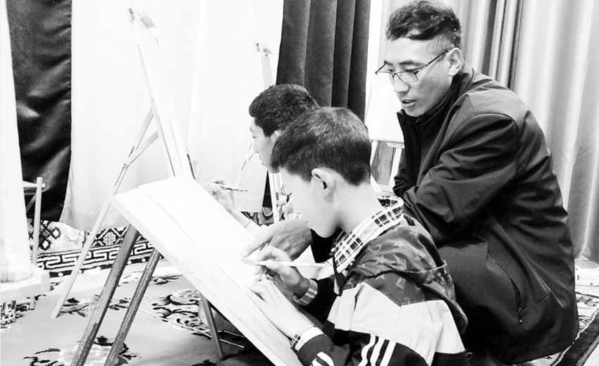 經(jīng)過一段時間的調(diào)整和恢復,幾經(jīng)思考,昂旺西繞決定嘗試用左手重拾畫筆。自學兩年后,在家人的支持和鼓勵下,踏上了前往西藏學習繪制唐卡的道路。從基礎的線條勾勒到給唐卡上色,5年的學藝生涯里,他不分晝夜、從早到晚地反復練習,好在有著多年彩繪的經(jīng)驗,在唐卡繪畫的學習上一點就通,克服左手畫畫的困難后,他很快便順利出師回到家鄉(xiāng)并經(jīng)營起繪制唐卡的工作室。