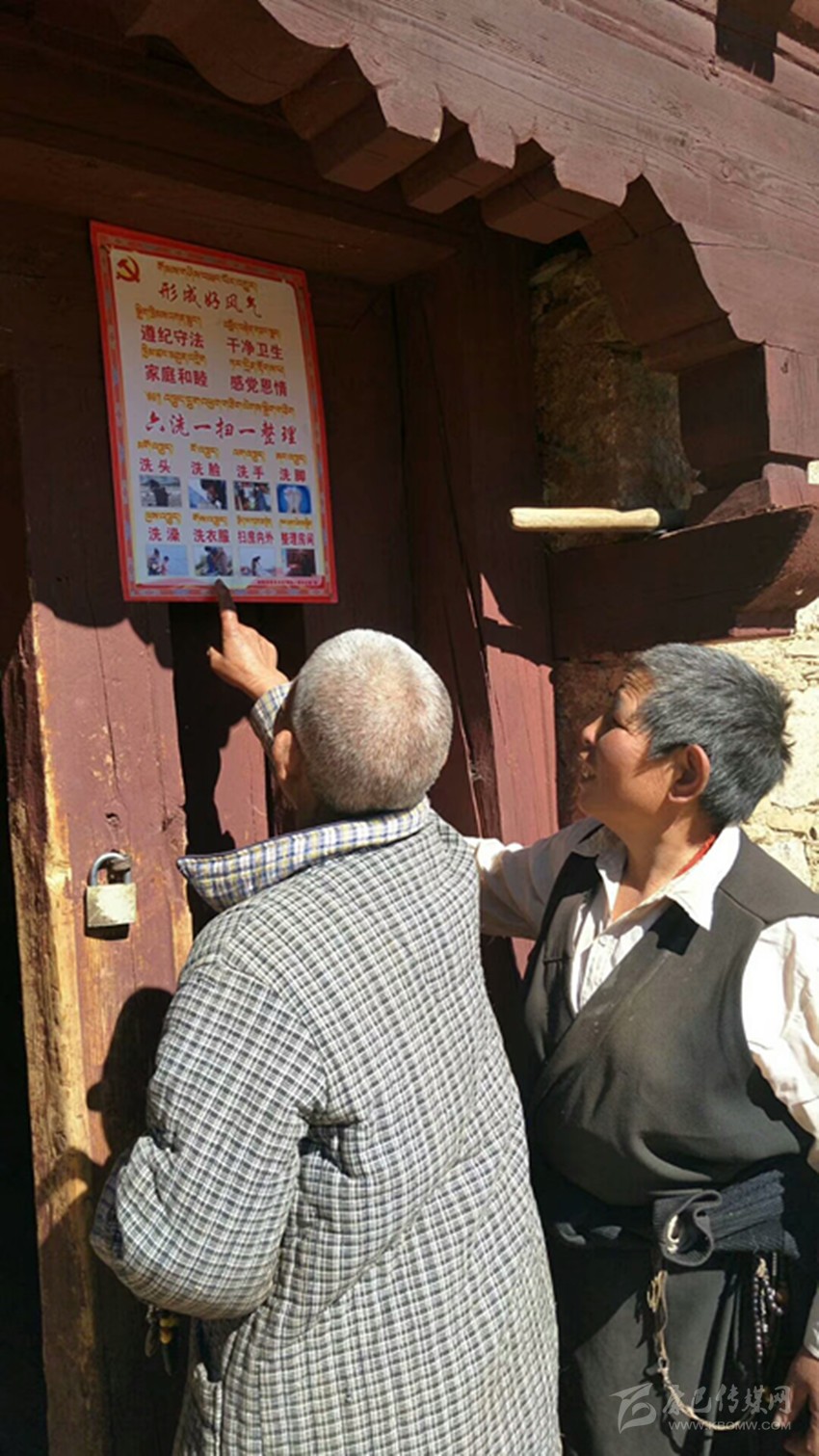 本網(wǎng)訊(扎西曲批 縣委中心報道組 葉強(qiáng)平 文/圖)11月9日,理塘縣甲洼鎮(zhèn)俄丁村老黨員格絨拉姆指著村民家門上掛的“六洗一掃一整理”紅牌,再次向村民講解宣傳相關(guān)要求,引導(dǎo)貧困群眾養(yǎng)成好習(xí)慣形成好風(fēng)氣。