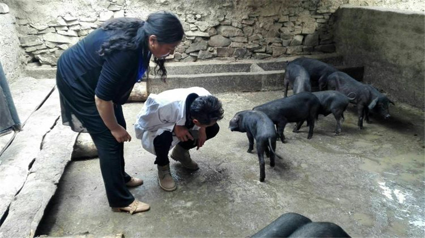 技術(shù)員到養(yǎng)殖戶家查看藏黑豬長勢。