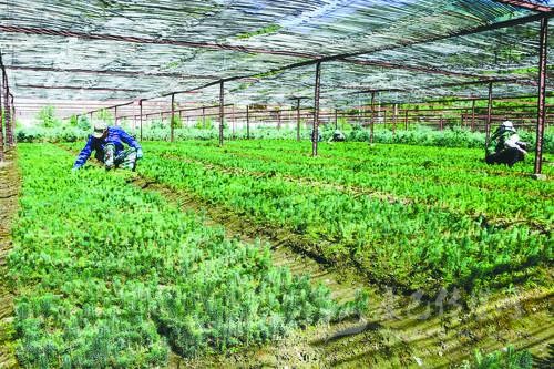 白玉林業(yè)局職工查看俄色樹苗生長情況。