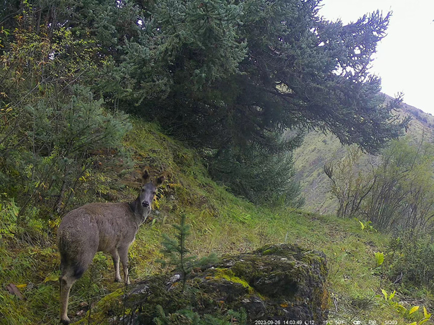 紅外相機(jī)影像資料顯示,一只金錢(qián)豹正走到石頭上眺望,一只棕熊媽媽正帶著幼崽經(jīng)過(guò),一群白唇鹿在紅外相機(jī)前悠閑好奇的觀望……從肉食性、雜食性到植食性,野生動(dòng)物們?cè)阽R頭里的不時(shí)亮相,一定程度證明保護(hù)區(qū)內(nèi)生態(tài)系統(tǒng)功能健康,食物鏈結(jié)構(gòu)完整。