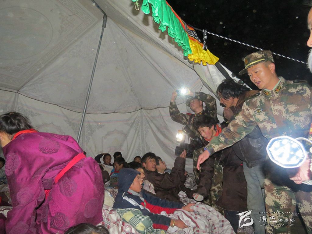 凌晨1時(shí),在江巴村,60名官兵挨家挨戶(hù)搜救轉(zhuǎn)移群眾,連夜搭建救災(zāi)帳篷。“同志,我的小女兒拉姆找不著了,可能埋在房子里了……”澤仁阿巴急匆匆地拉著武警戰(zhàn)士的手求援,“你家在哪里?快帶我們?nèi)ィ?rdquo;未等四十歲的澤仁阿巴說(shuō)完,官兵們奔向不遠(yuǎn)處的一堆倒塌的房屋。考慮到有人埋在下面,官兵們不敢用鎬刨用鍬鏟,在另一面墻上石片不停掉落的情況下,仍然紛紛撲下身子扒拉土石結(jié)構(gòu)的殘?jiān)珨啾冢罱K在兩個(gè)木箱中間找到了已哭成淚人的小拉姆,所幸6歲的拉姆安然無(wú)恙。
