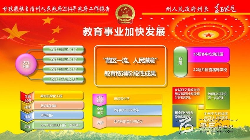 加大民生投入,全年民生支出139億元。全州城鎮(zhèn)新增就業(yè)7400人,城鄉(xiāng)低保實(shí)現(xiàn)應(yīng)保盡保;在全省民族地區(qū)率先實(shí)施醫(yī)療保險(xiǎn)制度城鄉(xiāng)統(tǒng)籌,異地就醫(yī)即時(shí)結(jié)算全面啟動(dòng);在全省率先出臺(tái)大病醫(yī)療保險(xiǎn)規(guī)定。教育事業(yè)加快發(fā)展。新建35所鄉(xiāng)中心幼兒園、22所片區(qū)寄宿制學(xué)校,州高級中學(xué)開工建設(shè)。全面落實(shí)教育助學(xué)惠民政策,兌現(xiàn)各類補(bǔ)助金4.58億元。城鄉(xiāng)居民基本醫(yī)保參保率達(dá)到99.13%,健康檔案建檔率達(dá)到92%;開工建設(shè)120個(gè)標(biāo)準(zhǔn)化鄉(xiāng)(鎮(zhèn))衛(wèi)生院和225個(gè)村衛(wèi)生室;衛(wèi)生信息化建設(shè)一期工程和遠(yuǎn)程會(huì)診、教學(xué)系統(tǒng)建設(shè)基本完成;兌現(xiàn)計(jì)劃生育“三項(xiàng)惠民制度”資金1809萬元。群眾文化生活日益豐富。建成縣“兩館”12個(gè);開工建設(shè)州民族體育館、州農(nóng)牧民演藝培訓(xùn)中心和14個(gè)縣級全民健身中心,建成農(nóng)民體育健身工程739個(gè);開展 “送文化下鄉(xiāng)”近千場;康巴文化研究院“四大工程”全面啟動(dòng)。深入實(shí)施“百千萬康巴英才工程”,人才科技工作扎實(shí)有效。扶貧移民工作成效明顯。完成1360個(gè)貧困村、19.91萬扶貧對象立卡建檔工作;實(shí)施整村推進(jìn)63個(gè)、連片開發(fā)項(xiàng)目4個(gè)、彝家新寨(村)17個(gè)、索改橋23座,易地扶貧搬遷9850人,2.65萬群眾生產(chǎn)生活條件得到改善。