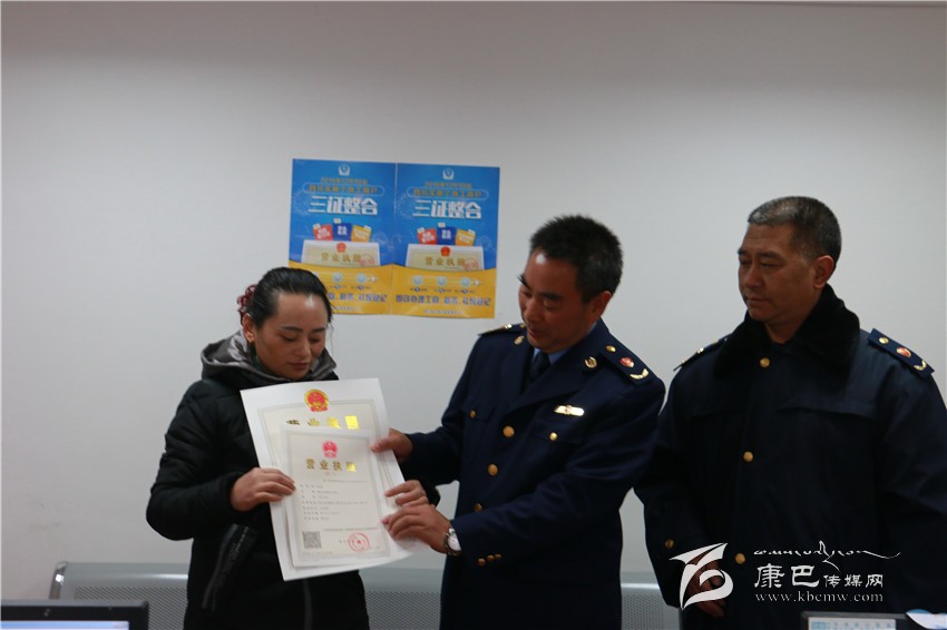 本網(wǎng)訊(迎春 文/圖)12月1日上午,我州首張個體工商戶“三證整合”營業(yè)執(zhí)照在康定市食藥工商局工商所辦證窗口,由州工商局副局長席小康和康定市食藥工質(zhì)局局長楊永勝一同,把新版?zhèn)€體工商戶“三證整合”營業(yè)執(zhí)照發(fā)放到個體工商戶張春碧手中。首發(fā)個體工商戶“三證整合”營業(yè)執(zhí)照拉開了我州個體工商戶“三證整合”登記的帷幕。今后,公民只需填寫“一張表”,向“一個窗口”提交“一套材料”即可辦理個體工商戶、稅務(wù)登記及社會保險登記。截止12月1日12點,我州共計發(fā)放個體工商戶“三證合整”新版營業(yè)執(zhí)照15份。