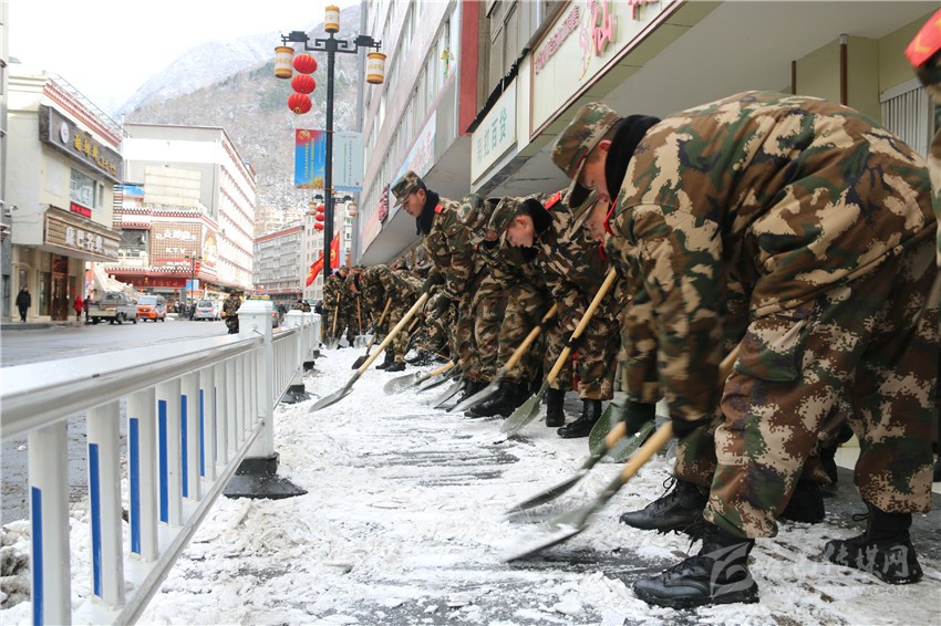 經(jīng)過(guò)奮戰(zhàn),僅半天時(shí)間,康定市城區(qū)主要路段大面積積雪被清除一空,全體官兵又一次用實(shí)際行動(dòng)踐行了“把駐地當(dāng)故鄉(xiāng)、視人民為父母”的光榮傳統(tǒng)。圖為官兵正在清理路面積雪。
