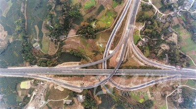 上午11時許,當(dāng)記者驅(qū)車到達(dá)對巖樞紐互通立交,用無人機從空中俯拍,這個縱橫交錯、恢弘磅礴的交通樞紐,宛如盤旋在云端的銀龍,又似在大地上延伸的血脈,其造型、規(guī)模、結(jié)構(gòu)都令人嘆為觀止。