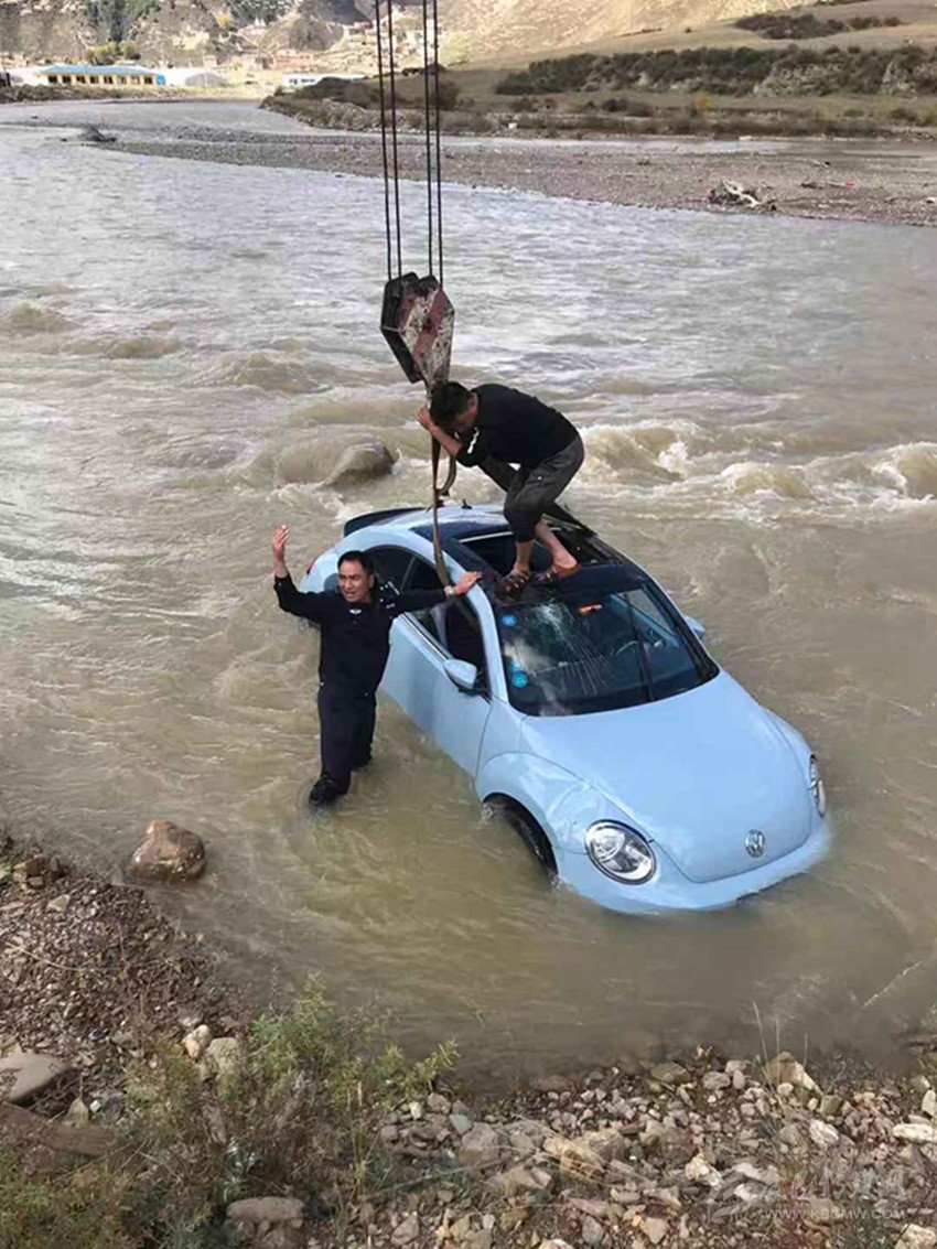 余斌全在冰冷刺骨的河中打撈墜河車輛。