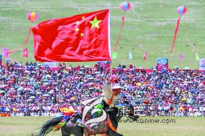 7月25日,第八屆康巴文化藝術(shù)節(jié)在玉樹藏族自治州開幕。數(shù)名參加開幕式的藏族老鄉(xiāng)高舉鮮艷的五星紅旗策馬狂奔,風(fēng)馳電掣,跨越扎西科賽馬場,一瞬間,歡呼聲震耳欲聾,開幕式進入高潮。