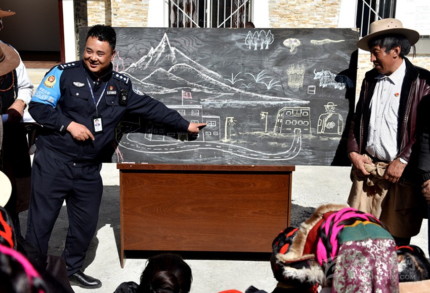 由于轄區(qū)藏族群眾大多都不識漢字、不會漢語,巴桑呷瓦便將自己的繪畫技藝運用到普法教育中,2018年10月,康定市公安局在對聯(lián)系鄉(xiāng)甲根壩開展精準(zhǔn)扶貧工作時,在全市范圍內(nèi)抽調(diào)了巴桑呷瓦等10名富有群眾工作經(jīng)驗的民警,他一邊負(fù)責(zé)沙德鎮(zhèn)派出所日常工作,一邊負(fù)責(zé)兼職扎日村精準(zhǔn)扶貧工作,用繪畫的方式為牧民群眾描繪脫貧致富夢。他把國家的相關(guān)法律法規(guī)、民族政策和惠民工程政策吃透并制作成故事性強、通俗易通的簡筆畫冊向老百姓解讀、宣講。在巴桑呷瓦妙趣橫生、詼諧幽默的“授課”下,深奧的法律政策變得淺顯易懂?!八漠嬓蜗笊鷦樱拥貧?,有我們的生產(chǎn)生活場景,我們喜歡看,他的講解幽默風(fēng)趣,我們聽得懂,只要他一下來,村民都圍在他的身邊,舍不得離開?!痹沾宓拇迕褚呀?jīng)把這位“畫家”警察當(dāng)作了自家人。