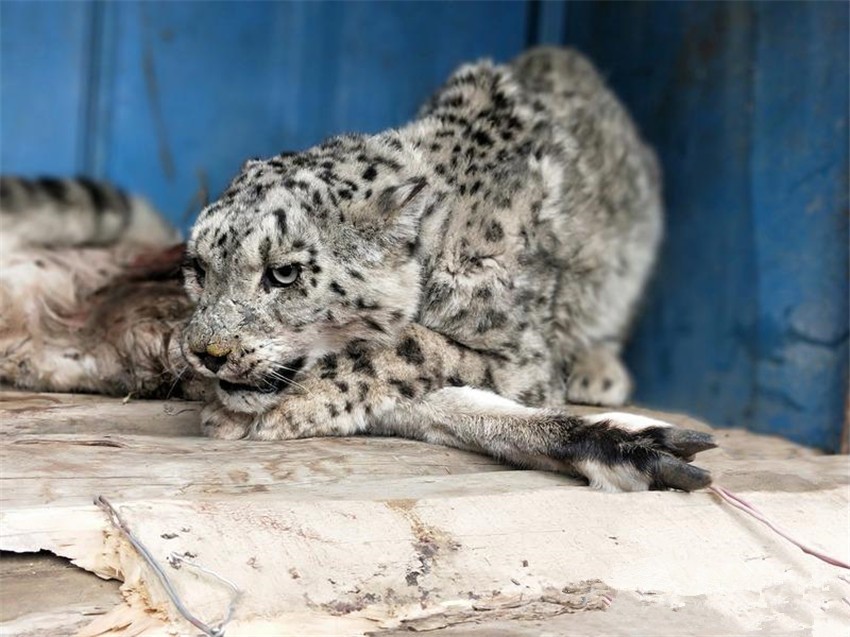 不放心受傷雪豹的隊(duì)員們隨即將發(fā)現(xiàn)的情況按屬地管理原則上報(bào)了該鄉(xiāng)黨委政府,聯(lián)系了行業(yè)主管部門(mén)林草局,并上報(bào)縣委縣政府,縣委政府主要領(lǐng)導(dǎo)高度重視要求鄉(xiāng)黨委政府和林草局賡即組織人員再到現(xiàn)場(chǎng)附近搜尋受傷雪豹看是否需要救治。當(dāng)一行人再次來(lái)到現(xiàn)場(chǎng),發(fā)現(xiàn)受傷的雪豹可能由于舍不得“獵物”去而復(fù)返正趴在巖羊旁,也可能由于傷情見(jiàn)人前來(lái)并未離去。大家在簡(jiǎn)單商議后,決定先由獸醫(yī)為雪豹現(xiàn)場(chǎng)查驗(yàn)傷勢(shì)。為防止雪豹傷人,在大家的配合下做出必要的防護(hù)措施后,開(kāi)始為雪豹查驗(yàn)傷勢(shì),經(jīng)查驗(yàn)發(fā)現(xiàn)該雪豹左前肢和左后肢均被咬傷,其中左前肢受貫穿性咬傷,傷勢(shì)較重,造成其無(wú)法行走,隨即大家決定將雪豹帶回救治。