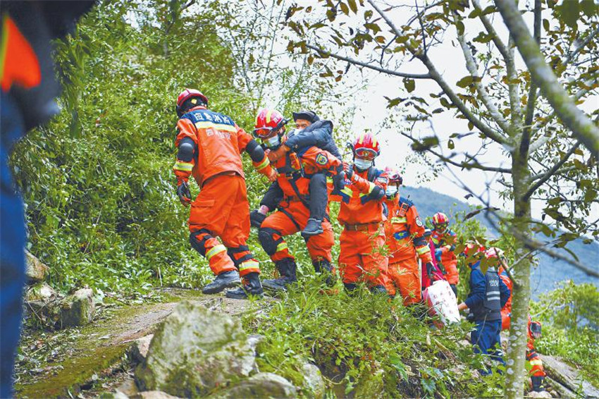 救援隊員協(xié)助紫雅場村最后一批村民下山,他們隨后將通過水路轉移至設在得妥鎮(zhèn)場鎮(zhèn)的受災群眾安置點。 四川日報全媒體記者 楊樹 攝