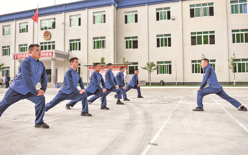 張大雄在帶領(lǐng)中隊(duì)人員開展體能訓(xùn)練。